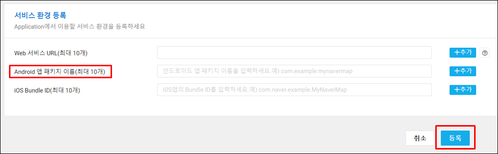 스크롤을 아래로 내려 개발하고자 하는 앱의 패키지명을 입력하고 등록 버튼을 선택합니다.